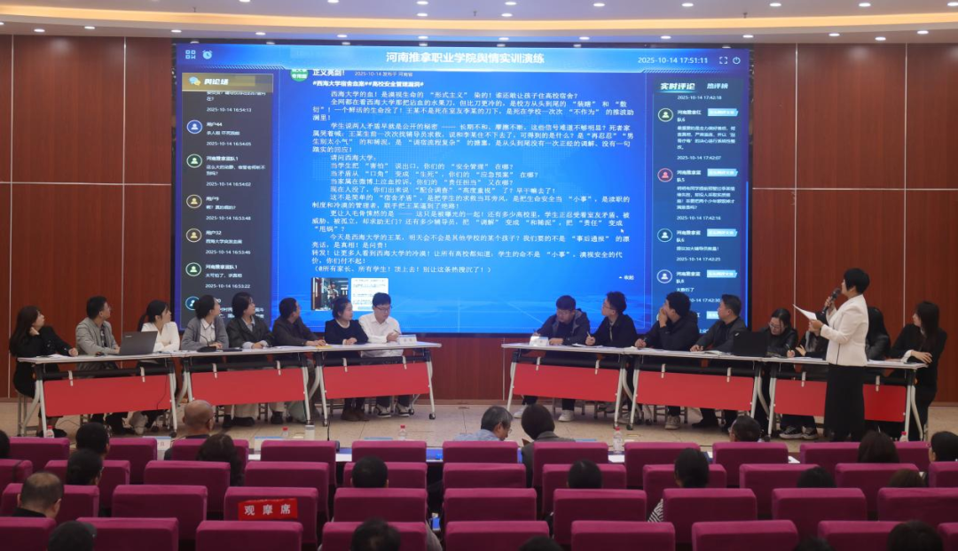 场景定制,通过全流程实操推演,全方位检验高校在舆情研判、响应速度与处置策略等方面的实战水平。郑州职业技术学院党委书记吕村、河南省教育宣传中心主任聂娜对参演双方表现进行精准点评,为高校舆情治理工作提供实践参考。