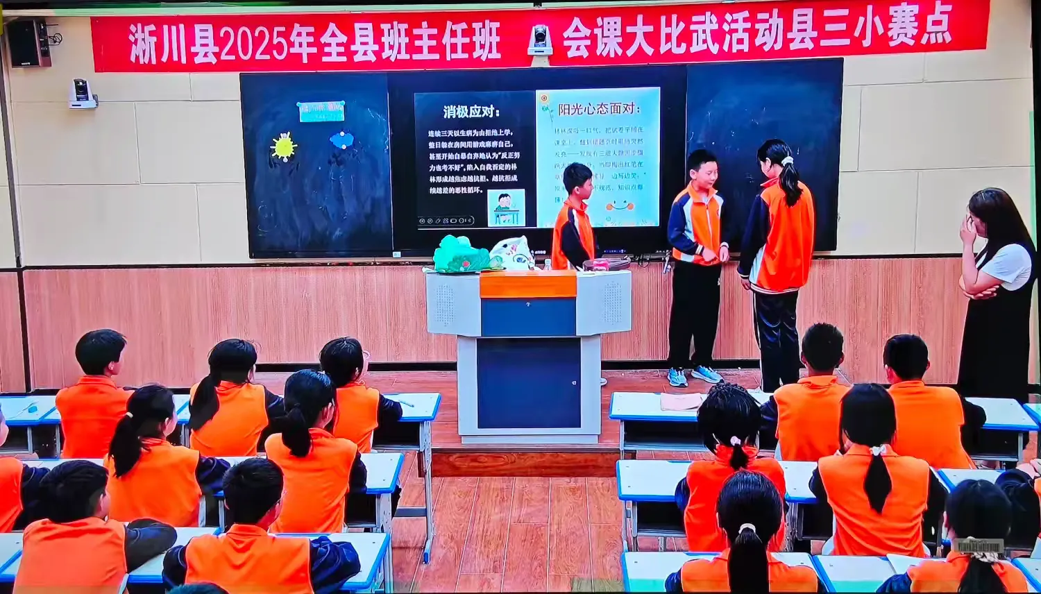 在比赛过程中,我们看到了一幅幅充满活力与趣味的教学画面:屏幕上的《哪吒·2》中可爱卡通形象吸引着孩子们的目光,天元鼎的炼化设计激发了他们的参与热情;老师们用五彩斑斓的小卡片作为教学工具,帮助学生更好地理解和掌握班会内容。此外,还有温馨的师生互动瞬间,如老师耐心指导学生解决问题,同学们围坐在一起认真学习、激烈讨论等,无不展现出教育者对孩子们悉心关怀的态度。