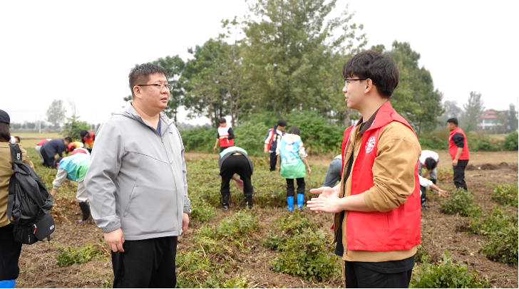活动期间,师生代表与驻村干部座谈交流,聆听他们带领村民发展农业、保障粮食生产的真实故事。学校驻郭店村第一书记李鑫详细介绍了村党组织建设、特色产业发展及秋收秋种推进情况,分享了党员带头抢收、帮扶困难群众的生动故事。马克思主义学院院长涂凯迪则从“思政+劳动+服务”融合的角度,阐述了将乡村实践转化为育人资源的意义。