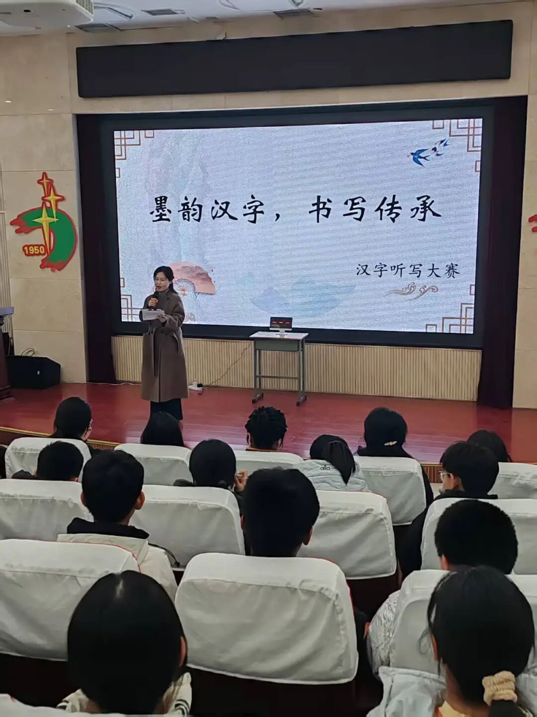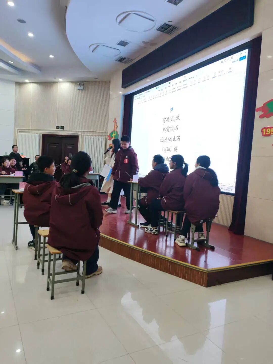 大赛尚未启幕,现场已氛围感拉满。《将进酒》国风金曲婉转流淌,古雅旋律与现代节奏碰撞交融,既点燃了青春激情,更铺就了深沉厚重的文化底色,让师生们在光影流转间沉浸式感受汉字背后的历史韵味与审美张力。来自七年级的六个组队18名“汉字小英雄”整装待发,精神抖擞,跃跃欲试。