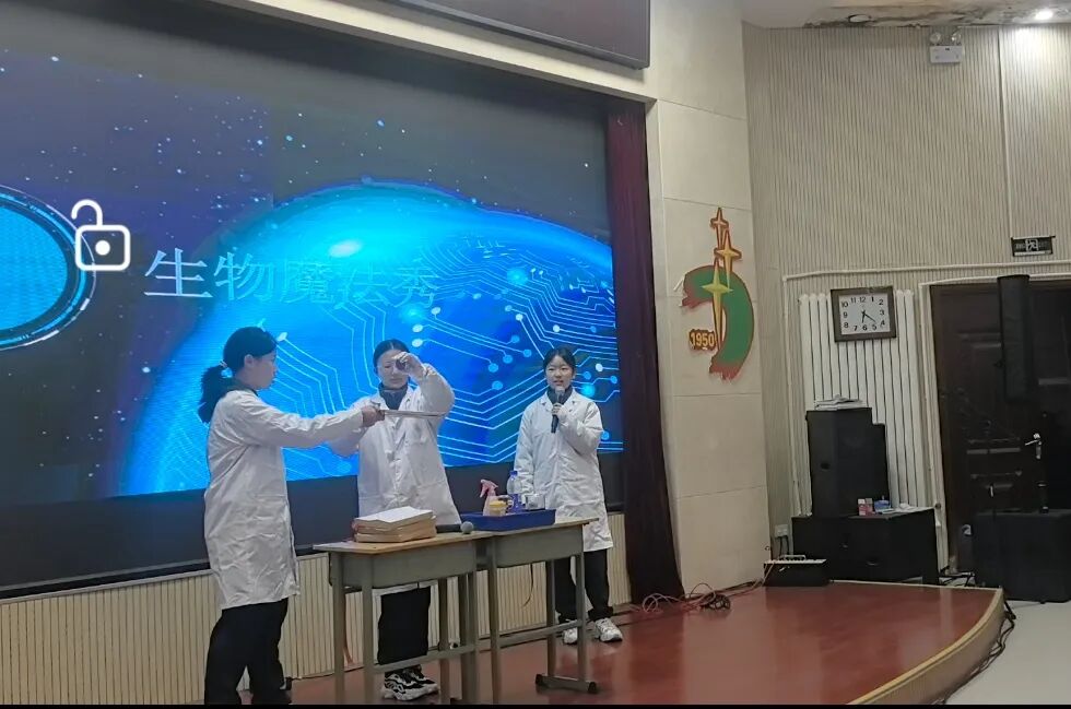科技秀现场,节目精彩纷呈,创意无限。首个表演“气球摩天轮”以其童趣与巧思吸引了全场目光,灵动气球搭配创意设计,尽显科创巧思。随后,九十二班师浩翰的独唱《teeth》用歌声点燃了全场热情,科学实验表演环节更是将活动推向高潮,充满视觉冲击的“火焰掌”表演震撼来袭,“乒乓球加特林”实验则通过压缩空气发射乒乓球击打目标,联动引瓶放电,展现了科创的硬核实力。生物魔法秀、生物rap等表演也通过趣味方式解锁了生物学科的奥秘,学科创意歌曲《化学里香》《苦茶子》及电功率主题创意表演《电功率卿》则将科学知识融入艺术,彰显了跨学科融合的魅力。