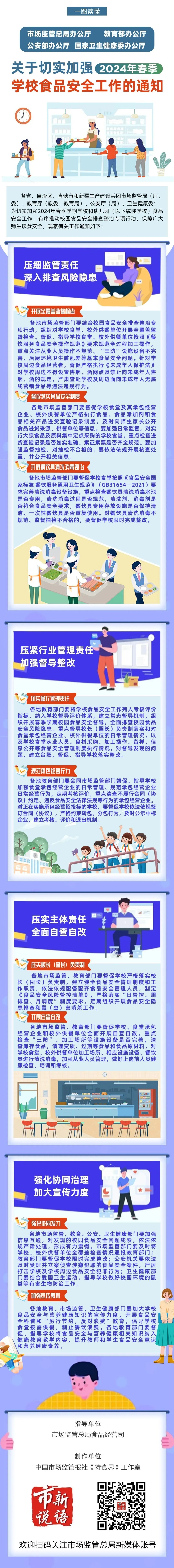 市场监管总局、教育部、公安部、国家卫生健康委近日联合印发《关于切实加强2024年春季学校食品安全工作的通知》,结合校园食品安全排查整治专项行动,部署开展全覆盖监督检查,深入排查校园食品安全风险隐患,保障广大师生饮食安全。具体内容一起了解——